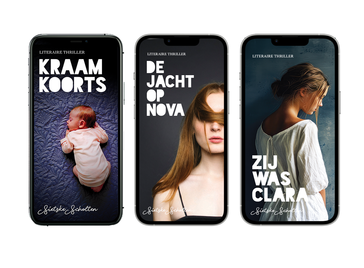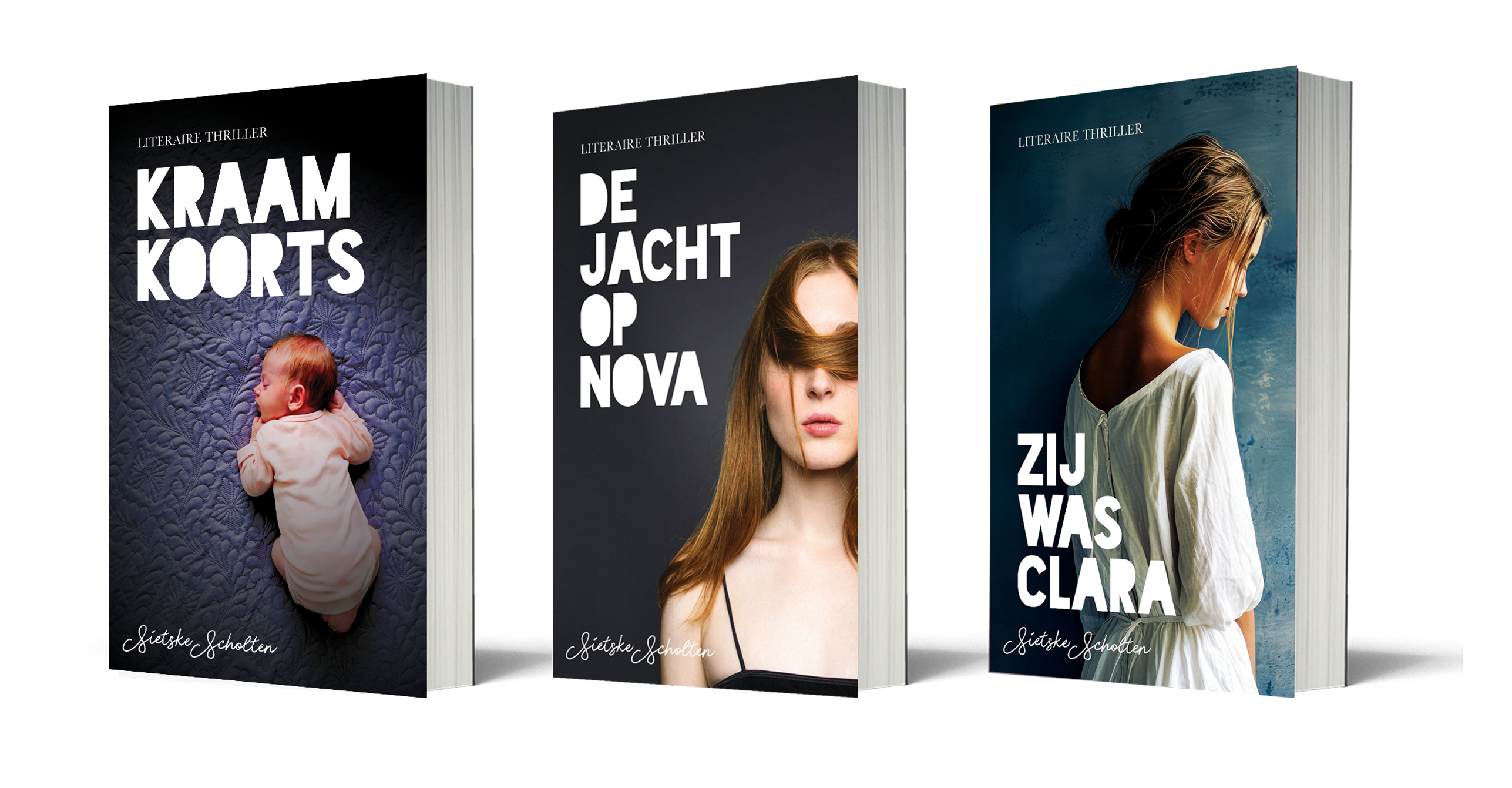 De literaire thrillers KRAAMKOORTS, DE JACHT OP NOVA en ZIJ WAS CLARA.