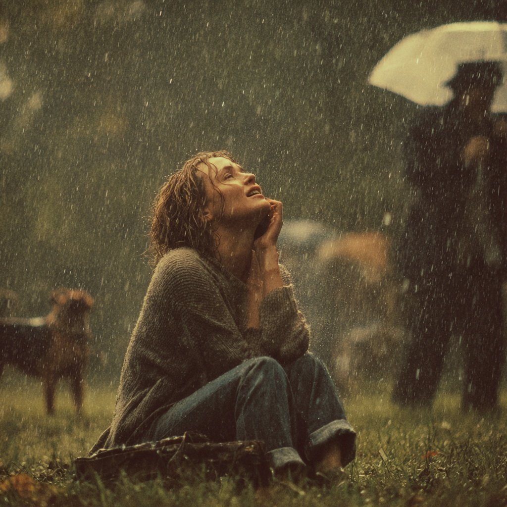 Door het gordijn van regen heen ziet ze midden op het grasveld een hond omhoog springen om een bal te vangen. Ze speurt naar het baasje dat hem gooide en ze ziet aan de overkant een man schuilen onder een paraplu. Ze kijkt om zich heen, naar het pad waar ze vandaan kwam.
