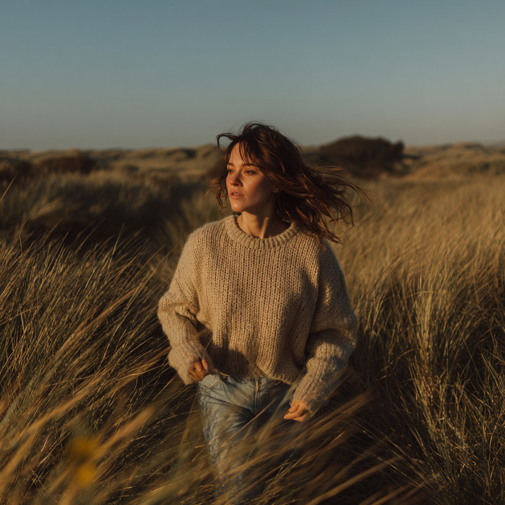 Ze strekt haar arm uit en laat haar vingers door het helmgras glijden. De stugge sprieten prikken in haar huid, blijven haken aan haar mouw. Het gras sist als een fluistering in de wind.